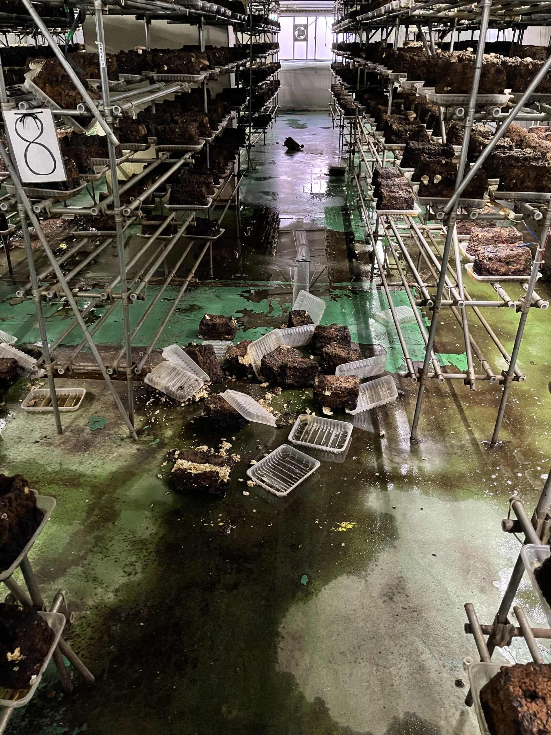 2月13日の夜による地震で、しいたけランドでも菌床の落下や棚の変形などの被害がありました。